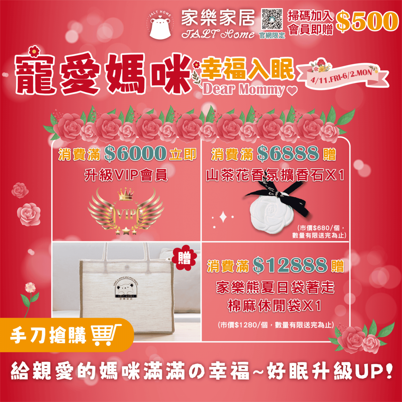 親愛的媽咪,今天開始要更愛自己 每天像超人一樣照顧全家,您是不是也該好好休息了 讓我們幫您找回專屬的溫柔時光 寵愛媽咪幸福入眠活動開跑囉 活動期間:𝟒/𝟏𝟏~𝟔/𝟐 🆂🆃🆁🆃 好康1:全館床墊特惠中 購買床墊打卡立即獲得"寵愛媽咪好禮" 好康2:單筆滿𝟞,𝟘𝟘𝟘元 升🅥🅘🅟專屬,每次購物享有甜甜價 好康3:消費滿𝟲,𝟴𝟴𝟴/𝟭𝟮,𝟴𝟴𝟴元 享有特別好禮 選張好床墊,就像每天睡在雲朵上一樣舒服 家樂想陪您一起,創造更多幸福的日常 小秘密... 快樂的媽咪讓全家都笑咪咪 快來門市,我們準備好等妳來~ 查看更多寵愛媽咪入眠 ▸https://pse.is/7edzsv 官網加入會員消費滿現折 ▸https://pse.is/5t4458 私訊小編找更多好康 ▸https://pse.is/5eumjz 社頭家樂家居𝑱𝒂𝒍𝒕 𝑯𝒐𝒎𝒆 精選品牌床墊 •枕頭 •寢具 #母親節快樂 #買床分期零利率
