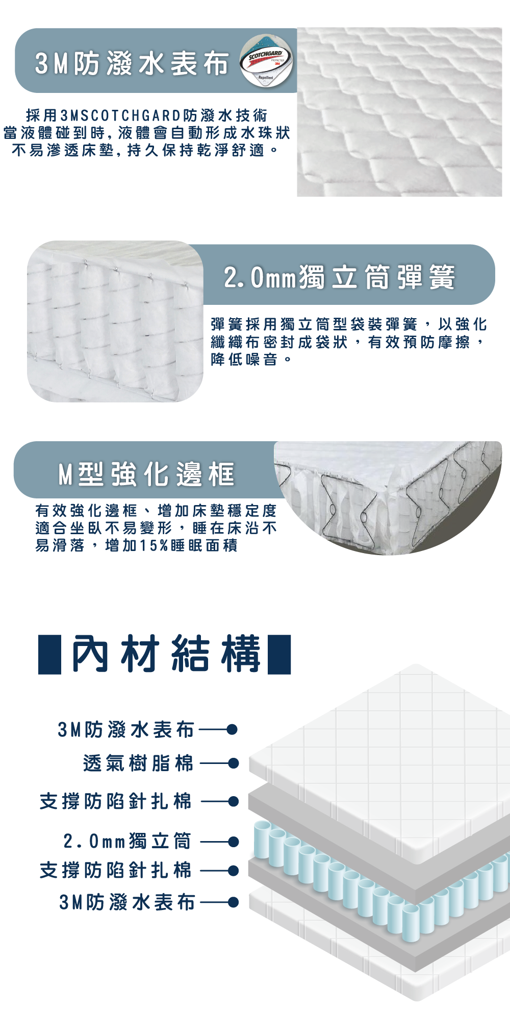 3M防潑水表布,不易滲透入床墊,持久保持乾淨舒適