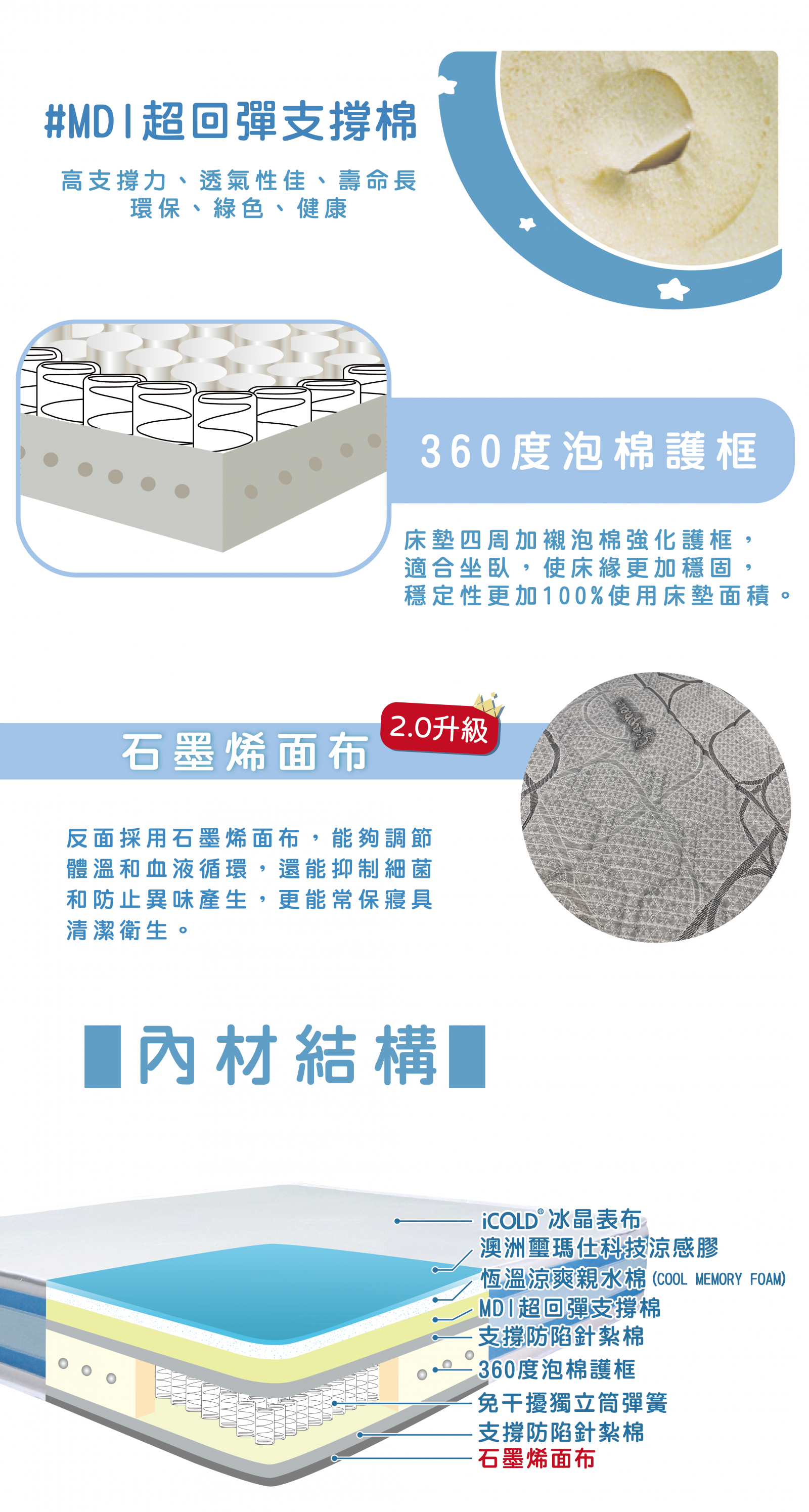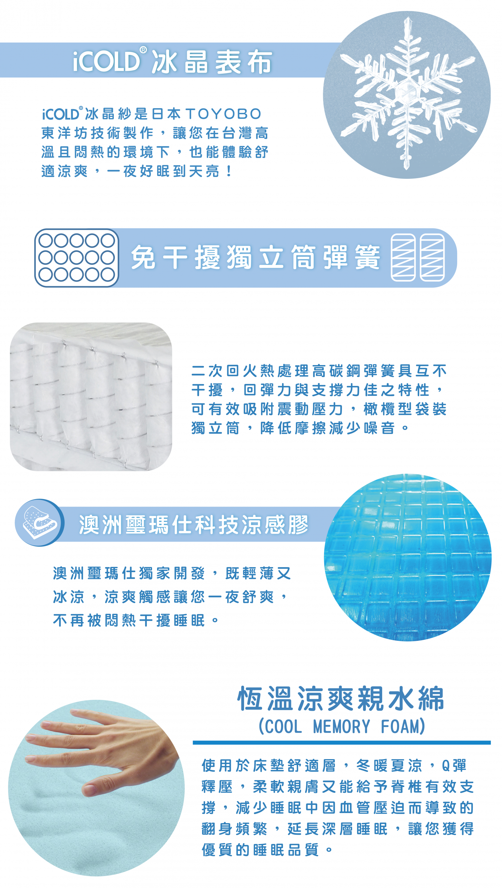 • 正面採用日本ICOLD冰晶表布,涼感舒適,快速吸收散熱,有效降低體感溫度,讓您在台灣高溫且悶熱的環境下,也能體驗舒適涼爽,一覺到天亮!