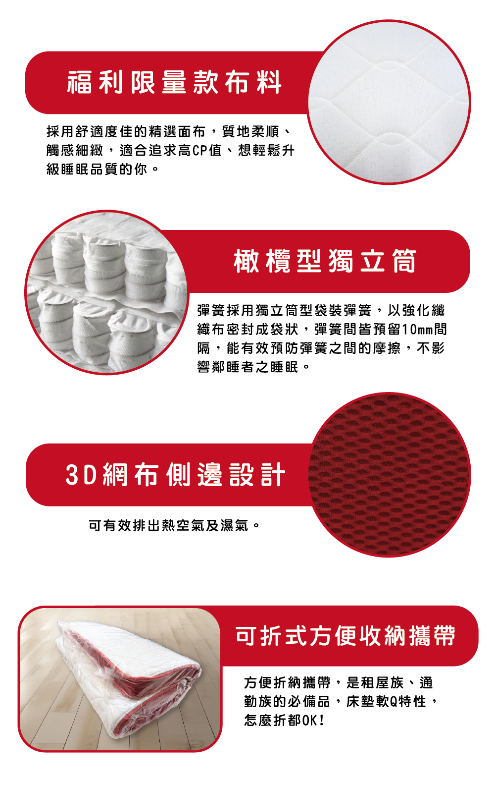 • 橄欖型獨立筒,有效減少震動