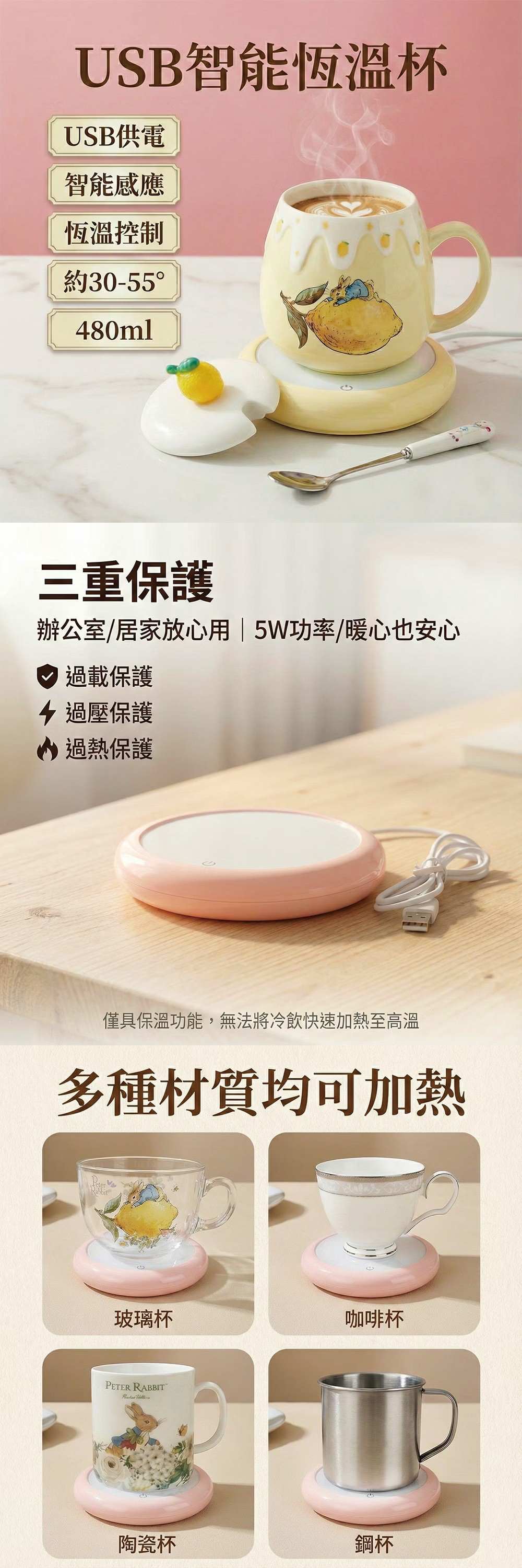 保溫杯墊:USB(電壓5V/功率2.5W)