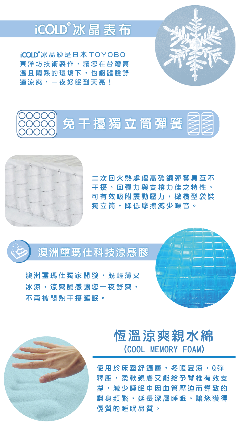 正面採用日本ICOLD冰晶表布,涼感舒適,快速吸收散熱,有效降低體感溫度,讓您在台灣高溫且悶熱的環境下,也能體驗舒適涼爽,一覺到天亮!