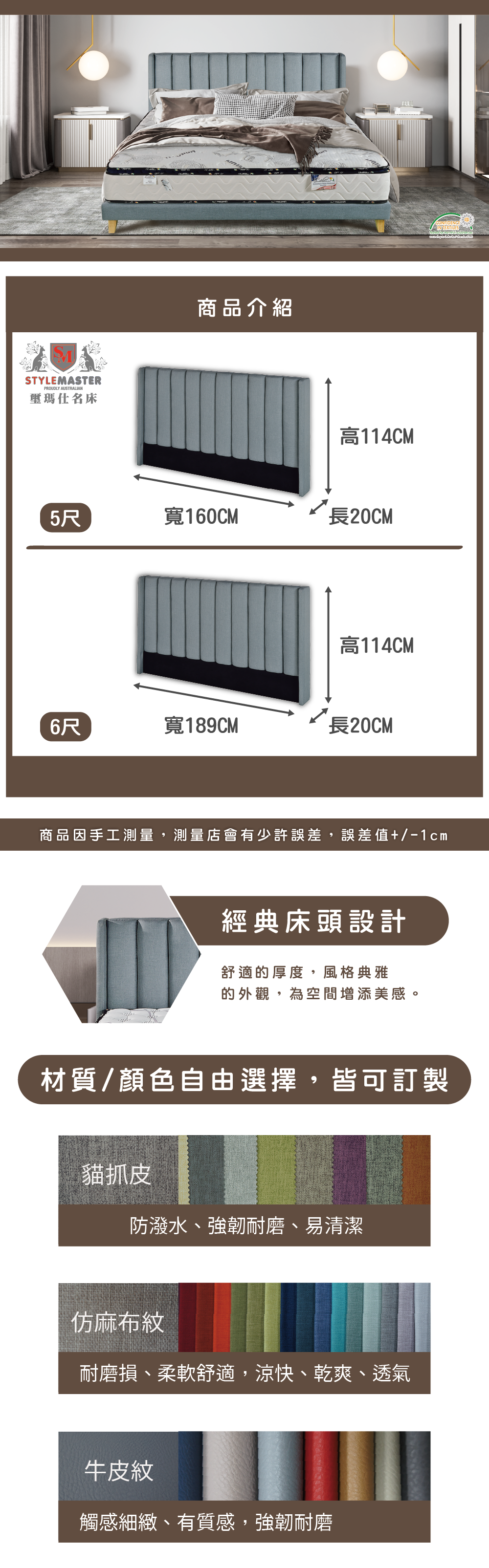 • 經典床頭設計,精緻縫線設計增添美感,給予空間獨特裝飾性