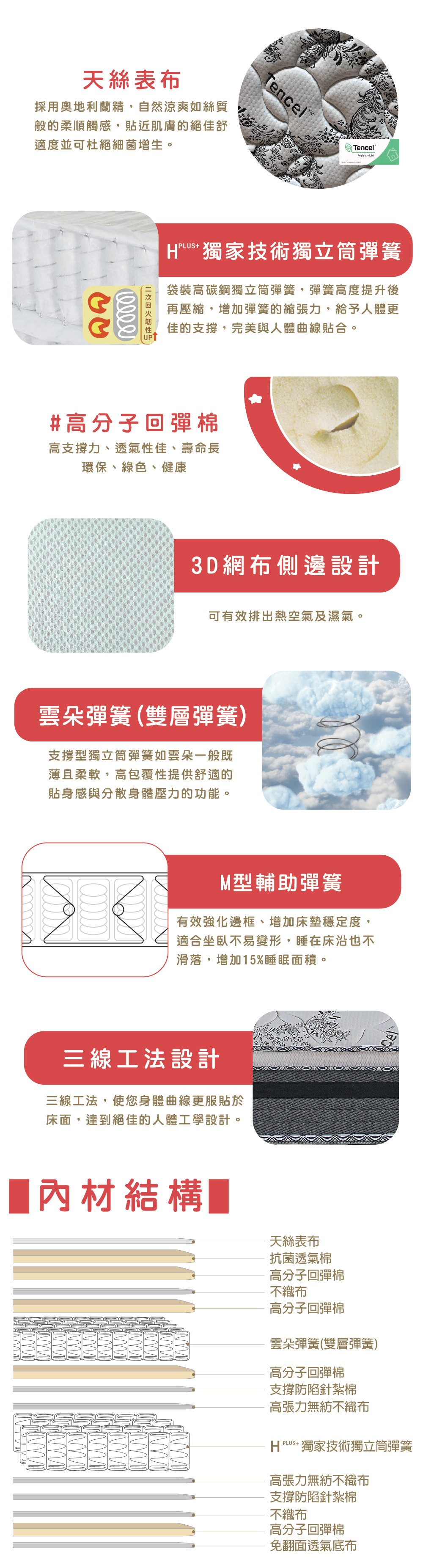 H PLUS+獨家技術獨立筒彈簧,增加彈簧縮張力,給予人體更佳的支撐力。