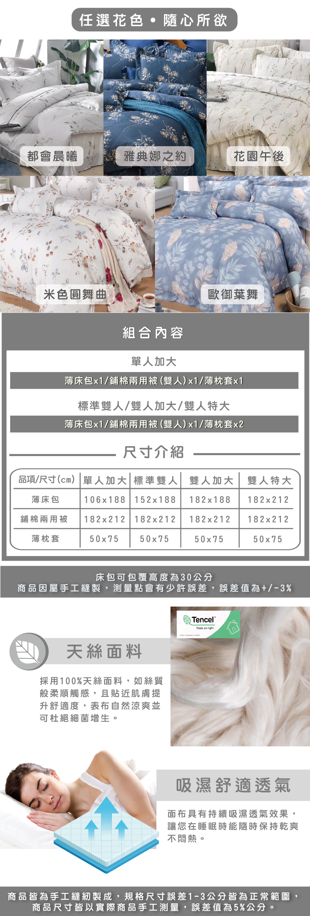 雙人特大6x7尺(182x212cm):床包x1/薄枕套x2/鋪棉兩用被x1