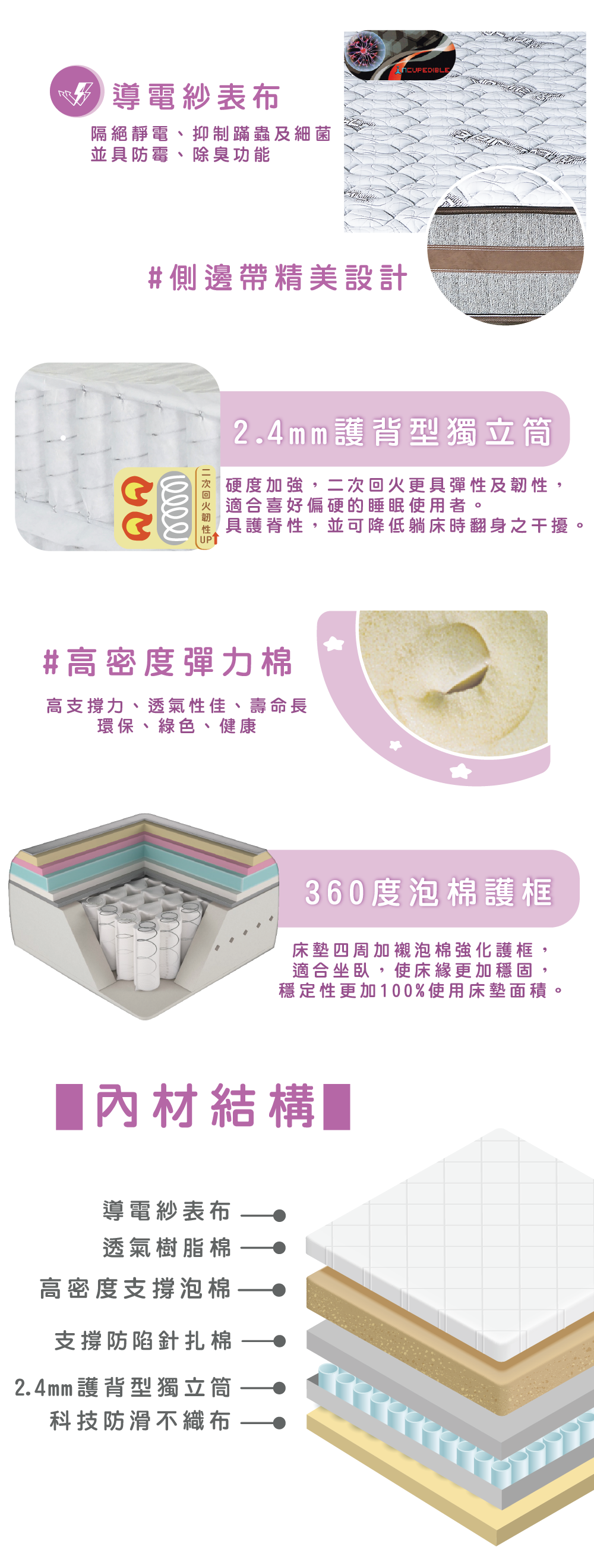 360度泡棉護框,使床緣更加堅固耐用,增加床墊穩定度,坐臥不易變形